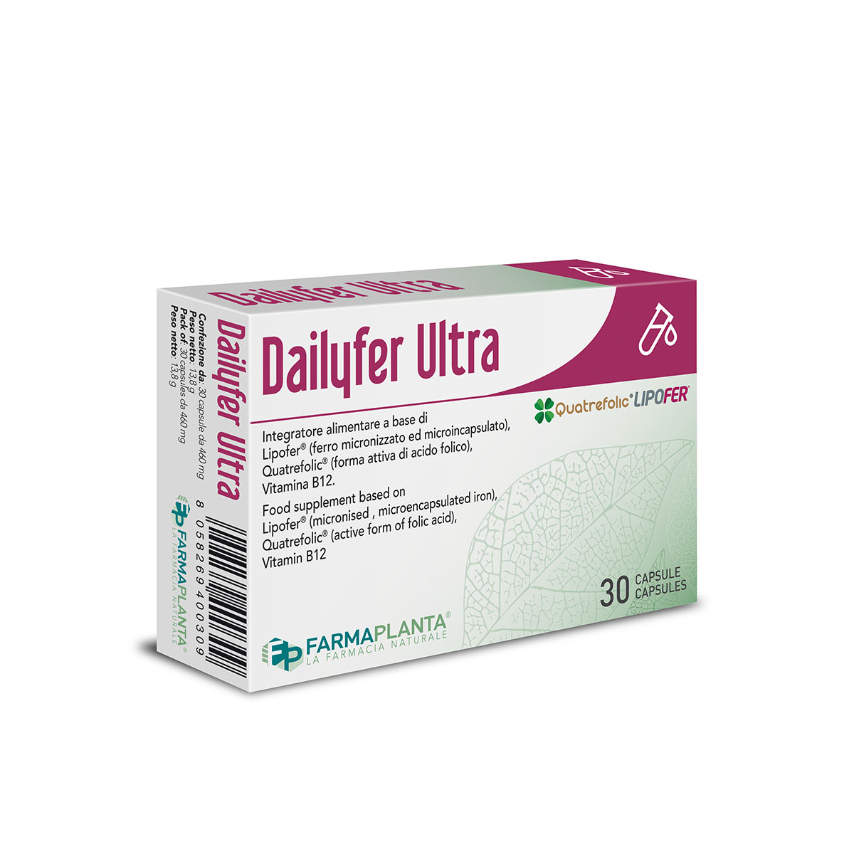 Dailyfer Ultra è un integratore alimentare che unisce la sinergia di Lipofer®, un sale di ferro brevettato in grado di aumentare l’assorbimento, proteggere il tratto digestivo dalle irritazioni e mascherare il sapore spesso sgradevole che si manifesta durante la terapia e Quatrefolic® un folato di quarta generazione molto più stabile e biodisponibile rispetto ai folati tradizionali.